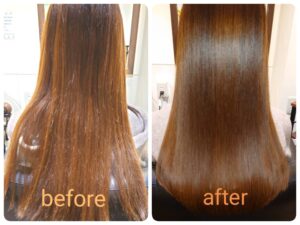 3.髪の毛が電子チャージで潤いたっぷりな状態で髪質改善トリートメントを塗布していきます。こうすることで艶感、手触りが劇的に変わり内部補修をしていきます。髪質改善トリートメントは少量のカラー剤を使用し髪の内部に入る力を使い一緒にトリートメント剤を内部定着(質感記憶)、表面定着(形状記憶)させて潤いを与えます。