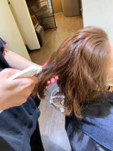 ⑤乾いた髪にアイロンを入れ、クセを伸ばしていきます。全てのクセを伸ばした後、ケアカットをして、定着液&髪質改善トリートメントをお付けして、流します。